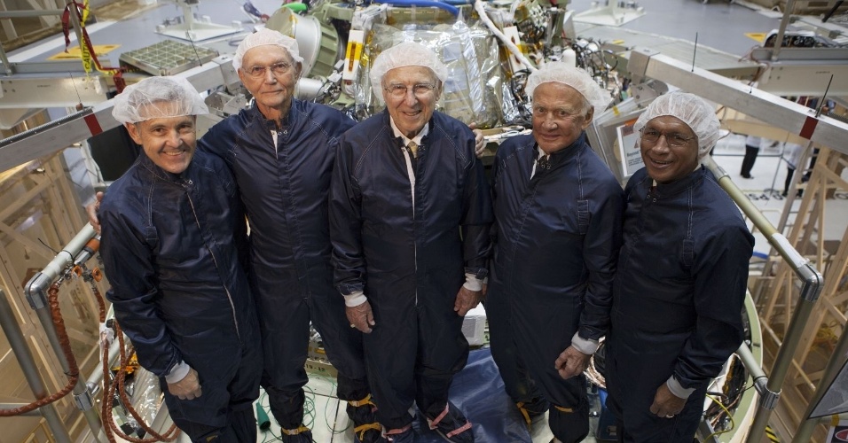 Imagem 59/61: PRIMEIROS PASSOS NA LUA - Astronautas e oficiais da missão da missão Apollo, que levou o primeiro homem a Lua, visitam o Centro Espacial Kennedy, na Flórida (EUA). A visita dos ex-astronautas faz parte da celebração do aniversário dos 45 anos do pouso do homem na Lua, em 20 de julho de 1969 NASA / Kim Shiflett