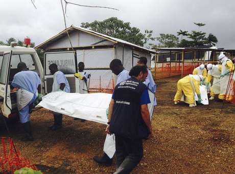 Voluntários carregam corpos em um centro liderado pelo grupo Médico Sem Fronteiras para pacientes com Ebola, em Kailahun, Serra Leoa, em 2 de agosto