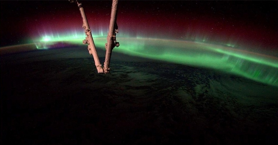Imagem 47/48: AURORA BOREAL - O astronauta americano Reid Wiseman, que participa da missão da ISS (Estação Espacial Internacional) captou esta imagem incrível das auroras dançando pela atmosfera terrestre nesta quinta-feira (21) Divulgação/Reid Wiseman/ISS
