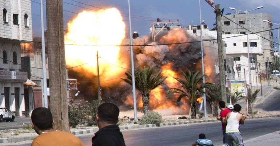 Imagem 437/437: 23.ago.2014 - Palestinos observam bomba atingir uma casa na cidade de Gaza, no mesmo dia em que Israel realizou vários ataques aéreos na faixa de Gaza, que mataram pelo menos cinco palestinos MAIS Roberto Schmidt/AFP