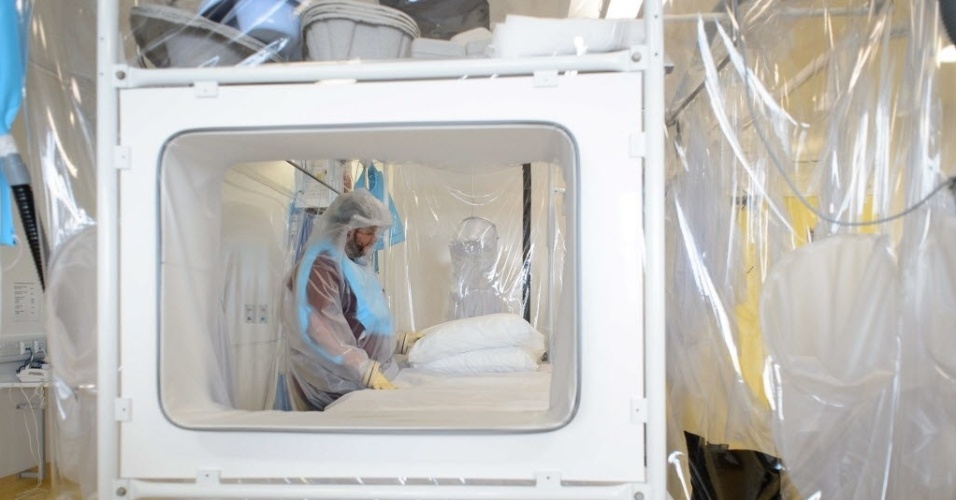 Imagem 48/53: 6.ago.2014 - Enfermeiro usa roupas de proteção no Hospital Royal Free, no norte de Londres, nesta quarta-feira (6), que irá receber um paciente diagnosticado com o vírus ebola. A unidade especializada permite que uma equipe de médicos e enfermeiros possa realizar o atendimento de qualquer pessoa com doença contagiosa MAIS Leon Neal/AFP
