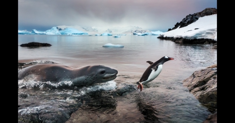 Imagem 3/10: O prêmio de melhor imagem foi concedido para "O Pinguim Sortudo", de Paul Souders, de Seattle, que mostra um pinguim escapando por pouco de ser devorado por uma foca leopardo. Premiado fotógrafo profissional, Souders teve imagens publicadas pelas revistas "National Geographic", "Time" e "Life" MAIS Paul Souders