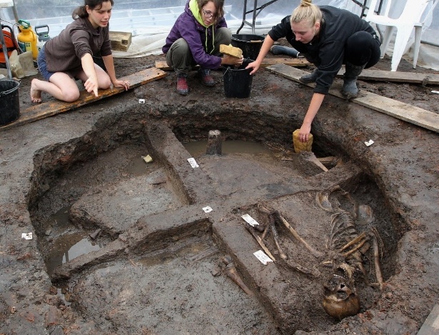Imagem 30/30: ARQUEOLOGIA NA FRANÇA - Pesquisadores examinam restos humanos em um antigo silo de grãos em Marsal, leste da França. Diversos esqueletos que datam de cerca de 500 a.C. estão sendo exumados, uma descoberta para saber mais sobre a sociedade local passadoFred Marvaux/AFP