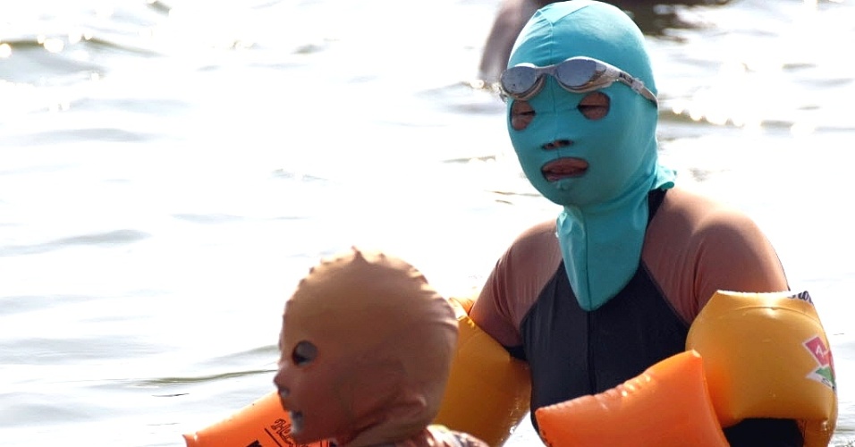 Imagem 13/35: Mulher e criança utilizam roupa de banho para o rosto, espécie de "cara-quini" (biquíni para a face), em praia lotada em Qingdao, na China. As máscaras são projetadas para proteger o rosto de queimaduras do sol, mas são usadas também para evitar picadas de insetos e o contato com águas-vivas AFP