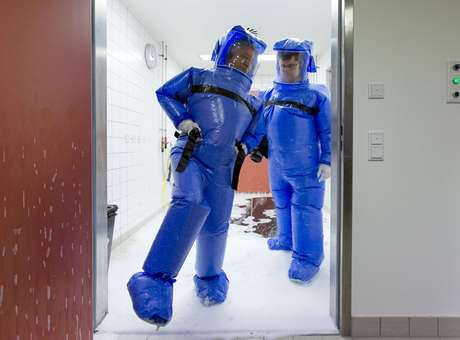 Agentes de saúde na Alemanha limpam ambiente onde estão internados pacientes em quarentena