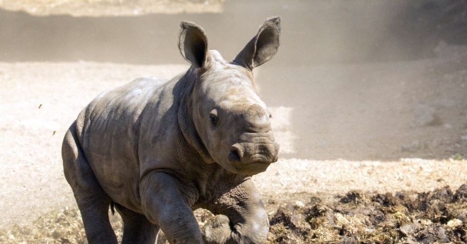 Imagem 20/38: Rinoceronte com apenas três semanas de vida corre em zoológico de Tel Aviv, em Israel. Segundo o Ramat Gan Safari, esta é a primeira fêmea de rinoceronte branco nascida nos últimos 20 anos. O animal será transferido para outro zoológico para participar do projeto de reprodução do rinoceronte branco que visa aumentar a população da espécie Jack Guez/AFP